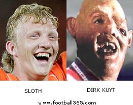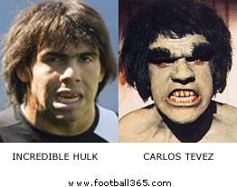 Недавно перебравшемуся в Англию голландцу Дирку Кюйту повезло меньше – ему достался великан Sloth из фильма 80-х, на лицо ужасный, но тоже добрый внутри. Видимо, как и Дирк. Не жалуют английские фаны и Карлоса Тевеса, который также на туманном Альбионе недавно. Он похож на Халка и какого-то героя игры. И ведь действительно похож!