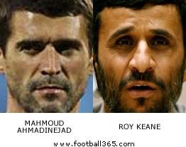 Ирландец Рой Кин, долгое время блестяще выступавший в составе Манчестер Юнайтед – мужик серьезный. Это даже не вопрос. Но и президент Ирана Махмуд Ахмадинежад может далеко пойти, особенно если таки обогатит свой уран. Сходство, конечно, определенное, вызванное, прежде всего, растительностью на лице (носы, скажем, у Роя и Махмуда совсем разные). А взгляд у Кина даже посуровее будет. А вообще он больше напоминает римского гладиатора из американских фильмов 50-х на эту тему.