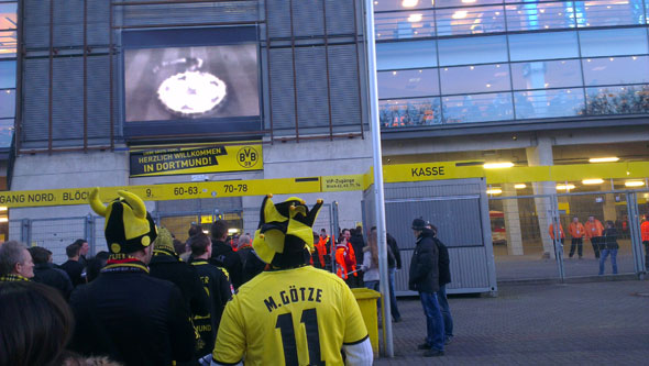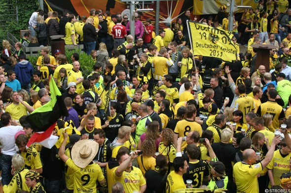 Нельзя сказать, что в городе накануне поединка царил особый ажиотаж. Билеты, впрочем, были выкуплены все, а из череды въезжавших в Дортмунд автомобилей нет-нет, да и выглядывала атрибутика «Боруссии». Вообще же надо понимать, что тот самый «особый» ажиотаж в Дортмунде могут вызвать лишь поединки с «Шальке» и «Баварией» в Бундеслиге, да визиты таких грандов, как «Реал» или «МанСити» в Лиге чемпионов. Зато в городе всегда царит истерия, посвященная самой «Боруссии». Поначалу, с непривычки, кажется, что весь город выкрашен в желто-черные цвета (домашней формы «боруссцев»). Дортмунд неимоверно любит свою команду, а в последние сезоны, сезоны больших побед «черно-желтых», фанатов у команды прибавилось еще больше.