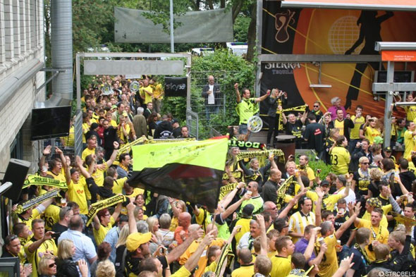 Все 90 минут ощущаешь себя в эпицентре праздника. Тем более что «Шахтер», как показывает игра, не способен испортить этот праздник болельщикам «Боруссии». После сказочной победы над «Шахтером» болельщики отмечают успех все в том же Strobels.