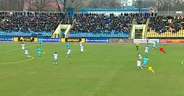 Вторая фаза. Аруна принял мяч и уже отдал передачу на Ярмоленко, который несколько секунд продолжает находится в оффсайде.