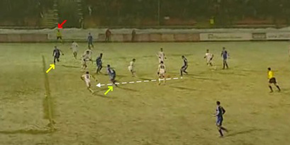 К такому решению техники тоже в общем–то нет претензий. Потому, что само по себе нахождение в положении «вне игры» не является нарушением правил. Претензии возникают к ведущему передачи И.Цыганику, который демонстрируя этот кадр объясняет зрителю, что именно зафиксировав оффсайд «другого» игрока «Говерлы» арбитр остановил игру.