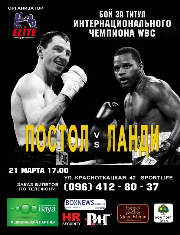 21 марта украинская компания «Elite Boxing Promotion», президентом которой является Степан Леонидович Черновецкий, проведет в Киеве очередной турнир по профессиональному боксу мирового класса. Главным событием вечера станет интригующий поединок за титул интернационального чемпиона WBC в первом полусреднем весе между представителем «Elite Boxing» Виктором Постолом (21-0, 10 нокаутов) и топовым американским боксером Генри Ланди (22-2-1, 11 нокаутов).