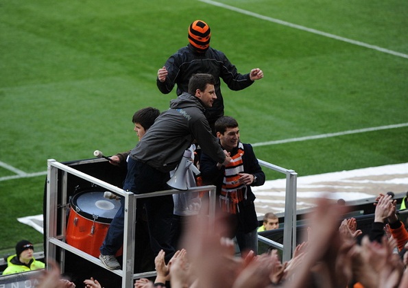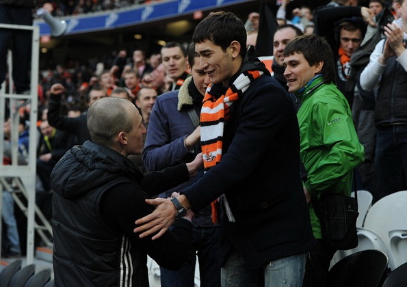 Тарас Степаненко, который не мог принять участие в матче «Шахтер» - «Черноморец» по причине дисквалификации, отправился поддерживать своих партнеров по команде в сектор ультрас «горняков». Отметим, что этот визит для полузащитника «оранжево-черных» стал уже вторым, так что с местными порядками Тарас был хорошо знаком. Но, к сожалению, забыл «розу» - фанатский шарф. Не беда – чтобы Степаненко чувствовал себя как дома, ему тут же предложили эксклюзивный фанатский вариант.