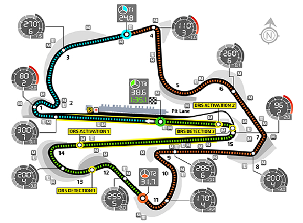 FIA абсолютно очікувано визначила дві зони для активації DRS протягом уїк-енду – скористатися прискоренням внаслідок зменшення рівня притискної сили пілоти зможуть на головній і задній прямих. Кожна зона має свою точку заміру відставання, тож гонщик, якого обігнали на прямій між 14-м і 15-м поворотом, має непоганий шанс повернути втрачену позицію на стартовій прямій перед першим віражем.