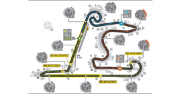 Будучи традиційним для архітектурного бюро Германа Тільке автодром у Шанхаї пропонує пілотам розгадати складну загадку налаштування боліду, де треба врахувати та збалансувати машину для проходження повільних поворотів, швидкісних віражів і двох довгих прямих. А також не забувати, що перший поворот разом із бенкінгом при виїзді на задню пряму є справжніми убивцями передньої лівої шини.
