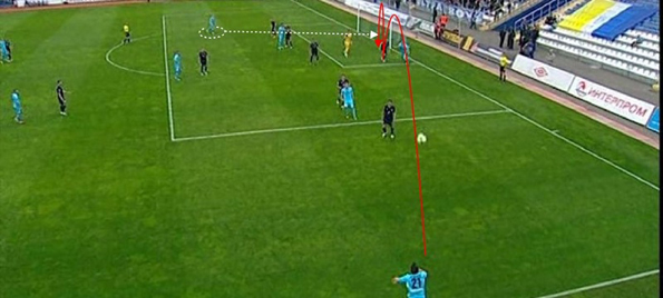 Сразу отметим ситуацию со взятием ворот при помощи прямого вбрасывания аута в ворота. Эта ситуация насколько нелепа и смешна, настолько и очевидна: мяч нельзя забрасывать аутом в ворота (красное), где его уже за линией ворот добьет набегавший Трухин (белый). Возможно, именно дополнительный ассистент определил, что Трухин забивал мяч, уже пересекший линию. Теперь переходим к забитому из явного оффсайда голу.