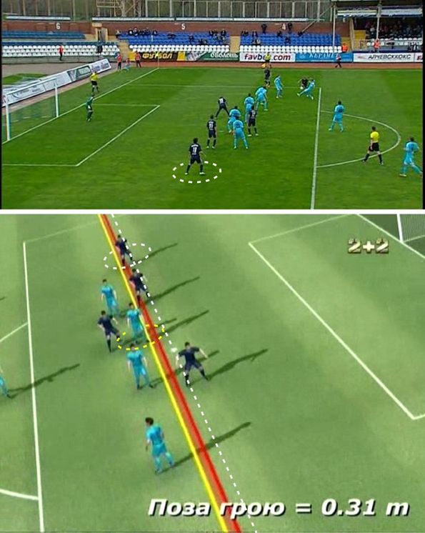 Здесь канал «2+2» вновь запускает тяжелую артиллерию – их волшебное оборудование четко фиксирует безоговорочный оффсайд, зрительно наблюдаемый сразу у трех (!) игроков «Металлурга». Двоих из них, как не касавшихся мяча, можно считать находящимися в пассивном оффсайде.