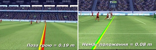 В версии программы «Про футбол» исходная желтая линия проведена по носку левой ноги защитника (в желтом круге) , а итоговая красная – по правой Димитрова (в белом круге). Это методически неверно. Все тот же Пьерлуиджи Коллина, вскользь комментируя работу этой системы, в свое время намекал об этом словами «откуда они меряют?».