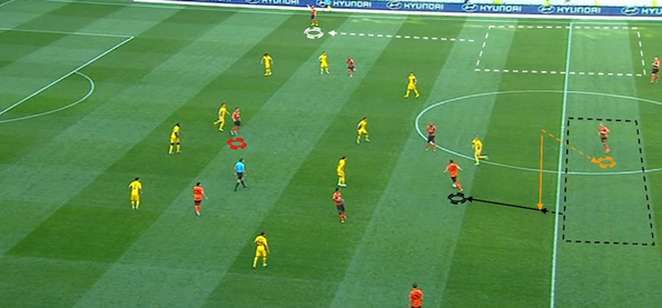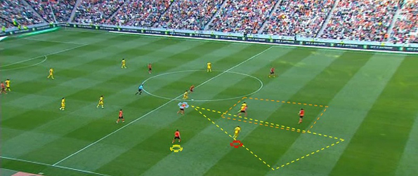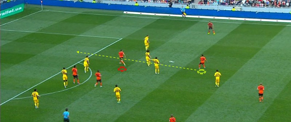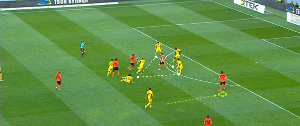 Одновременно справа на фланге, высоко на линии защитников «Металлиста», подняв руку, просит мяч Дарио Срна (белый). Он оставил свою зону, которая в данный момент выглядит бесхозной. Чуть позже Срна таки получит мяч от того же Гречишкина. Обратите внимание, что позицию центрального нападающего занимает Мхитарян (красный).
