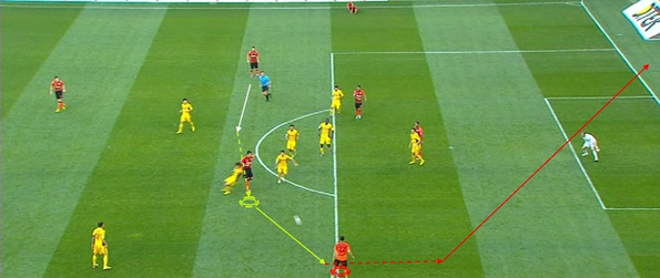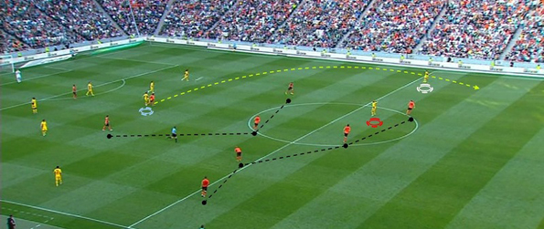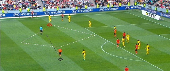 Возможно, здесь виновен именно вышедший вместо Бланко Виллиан (красный). В данный момент он ничем не занят и не прикрыл зону, в которую для получения мяча уже спешит Фернандиньо (черный). Именно он и отдаст результативную передачу.