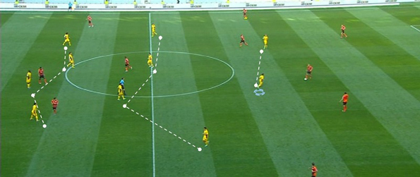 Все приведенные на фото эпизоды свидетельствуют о том, что после замен «Шахтер» в принципе не изменил характера своей игры. Поперечные розыгрыши мяча в отличие от момента с быстрой атакой выше не позволяли создать сколько-нибудь опасной ситуации у ворот гостей. Выход был найден, когда при розыгрыше аута зазевалась оборона «Металлиста». Таким образом, гол был забит лишь в результате розыгрыша стандартного положения.