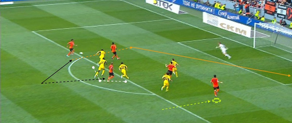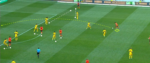 А вот здесь совсем иной случай. В скоростной атаке защита «Металлиста» отыграна и разрушена, Тейшейра (оранжевый) получает мяч от Фернандиньо (черный), вырывается на оперативное пространство и получает возможность нанести удар. Лишь неточность вновь не позволяет сравнять счет на 71-й минуте. Илсиньо (зеленый) вновь пытается открыться.
