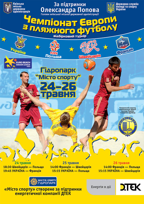 Три дні – 24, 25 та 26-го травня у столичному Гідропарку відбудеться відбірковий етап Чемпіонату Європи з пляжного футболу - Euro Beach Soccer League Kiev 2013! Київський тур ЧЄ пройде у «Місті Спорту» київського Гідропарку. У турнірі візьмуть участь провідні збірні континенту – Франція, Швейцарія, Польща та Україна.