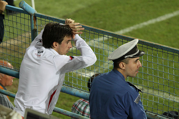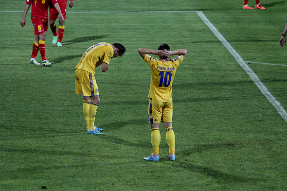 Нападающий сборной Украины покадает поле.