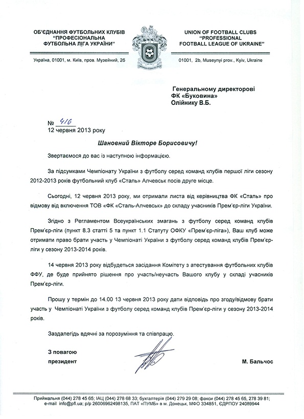 Сьогодні в окремих ЗМІ з'явилася інформація про те, що ФСК «Буковина» не прагнув стати клубом Прем'єр-ліги. Ми ж вирішили запропонувати Вашій увазі лист від ПФЛ України та відповідь, яку надіслав ФСК «Буковина» цій організації. Тепер у футбольної громадськості краю та вболівальників є можливість переконатися у тому, що наш клуб не відмовлявся від можливості виступити у Прем'єр-лізі.