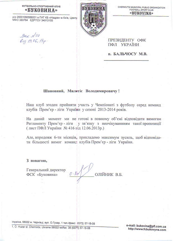 Наступного дня наш клуб відправив відповідь ПФЛ України, де давав згоду на участь у чемпіонаті України – 2013/2014 серед команд Прем'єр-ліги. І все ж, ФСК «Буковина» наголосив на тому, що ще не готовий у повному обсязі відповідати вимогам Регламенту Прем'єр-ліги , бо чернівецький колектив неочікував пропозиції щодо підвищення в класі.
