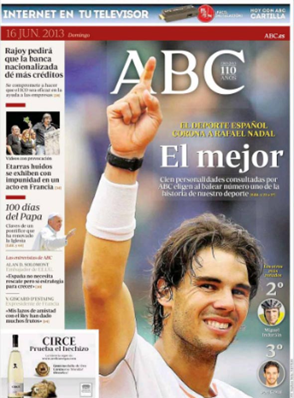 По итогам опроса Надаль занял первое место, опередив легендарного велогонщика Мигеля Индурайна и знаменитого баскетболиста Пау Газоля.