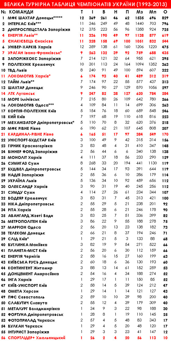 Велика турнірна таблиця ЧУ з футзалу (1993-2013)