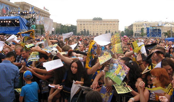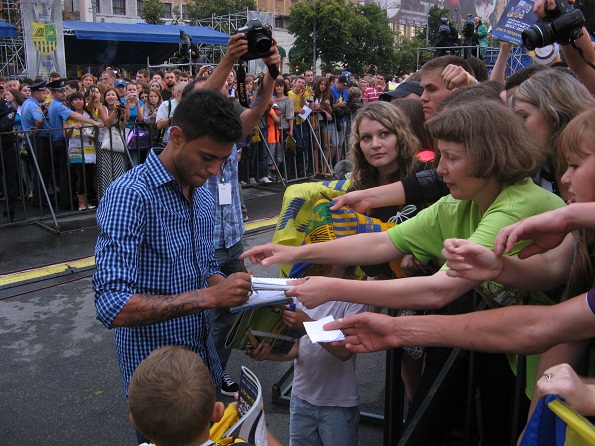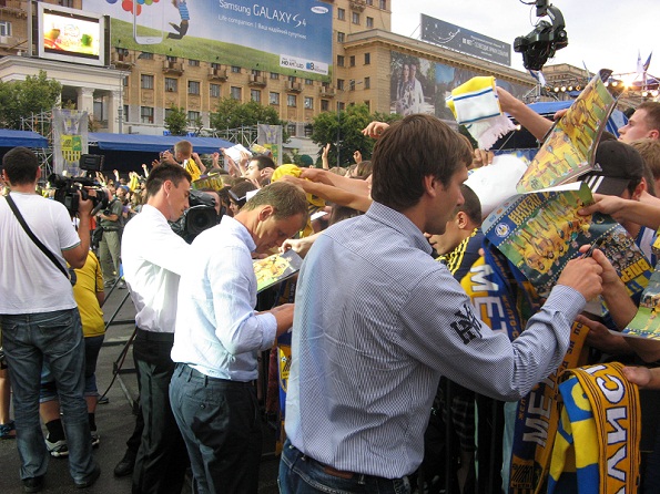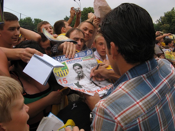 Перед началом праздника прямо перед сценой состоялась автограф-сессия игроков «Металлиста». От желающих получить заветный росчерк не было отбоя, а потому здорово потрудиться пришлось всем: и Олегу Шелаеву, и Папе Гуйе, и Себастьяну Бланко, и даже сильно хромавшему Клейтону Хавьеру, который, несмотря на полученную недавно травму, тоже не обделил болельщиков своим вниманием.