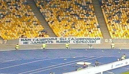 На матче «Зенит» - «Динамо», который состоялся в воскресенье на столичном НСК «Олимпийский», традиционные сектора ультрас пустовали, а на трибунах виднелся баннер с надписью «Нам Газпрома всі газопроводи не замінять нашої свободи».