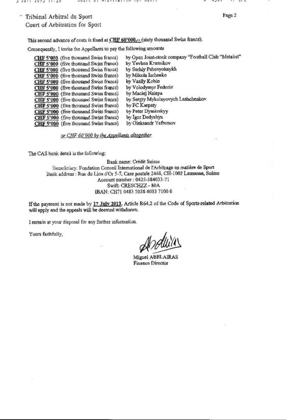 - Уверяю, что у национальной Федерации нет никаких финансовых проблем. Она может оплатить любые расходы, связанные со своей деятельностью. Однако, что касается вопроса об оплате судебных издержек в CAS, то позиция ФФУ такова: тот, кто обжалует действия и решения национальной Федерации по данному делу, тот и должен оплачивать собственные жалобы и несогласия с решениями Федерации. ФФУ никоим образом не нарушает регламент CAS. Из статьи R64.2 регламента следует, что если ответчик, коим является в этом случае ФФУ, не оплачивает судебные издержки, они возлагаются на стороны, то есть апеллянтов. Таким образом, ФК «Карпаты» не протягивал руку помощи ФФУ, а выполнил решение CAS и, к тому же, поторопившись, провел оплату за тех, кому CAS предложил это сделать в соответствии с письмом от 3 июля 2013/MA/kh(vm).