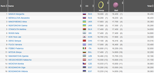 Вчера в Казани начались соревнования среди гимнасток - «художниц». Согласно программе соревнований, в воскресенье состоялись выступления с обручем и мячом. По итогам двух видов представительницы Украины - Алина Максименко и Анна Ризатдинова - идут третьей и четвертой соответственно. Лидирует россиянка Маргарита Мамун, на втором месте - ее соотечественница Александра Меркулова.
