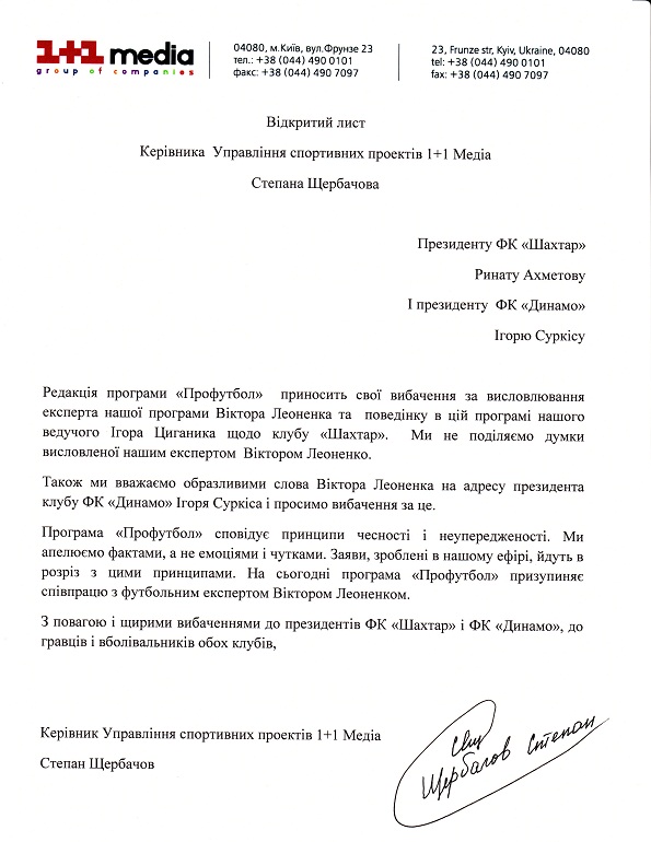 Руководство телеканала «1+1» в открытомписьме попросило прощения за высказывания эксперта Виктора Леоненко и ведущего Игоря Цыганыка в адрес «Шахтера» и президента киевского «Динамо» Игоря Суркиса.