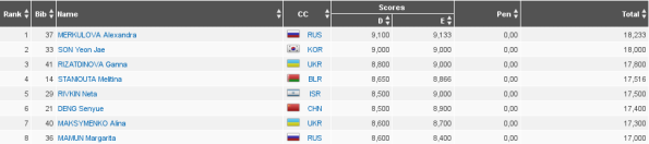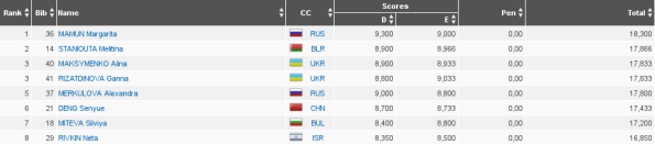 Украинки Алина Максименко и Анна Ризатдинова активно участвуют в распределении наград. Так, в упражнениях с обручем наши девочки разделили третье место, а в финале с мячом еще одну бронзовую медаль выиграла Анна Ризатдинова.