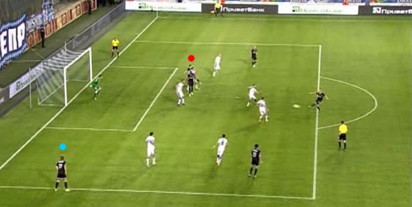 Оценка эпизода от Sport.ua: На стоп-кадре хорошо видно, что в момент времени «удар+» (то есть уже спустя мгновение) Чайковский и Данило (отмечены красным) находятся на одной линии с защитниками «Днепра». Поэтому мешал ли Данило вратарю, подправил ли полет мяча Чайковский касанием – не суть важно с точки зрения правил игры. Они имели право участвовать в эпизоде любым дозволенным образом. Позицию Хомченовского (синий) очевидно принимать в рассмотрение не следует, ведь он находится на позиции, способной быть классическим примером «пассивного» положения вне игры. Гол забит правильно и должен был быть засчитан.