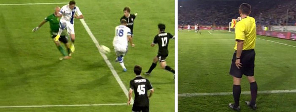 Оценка эпизода от Sport.ua: Как и в случае с пенальти «Карпатам», действие происходит на входе в штрафную площадку. Однако на этом сходство эпизодов заканчивается, ибо данная ситуация гораздо более сомнительна. Семинин касался рукой соперника, однако движение руки было направлено скорее поперек движения. Писоцкий же падает по направлению бега, причем уже после того, Симинин убрал руку. Скорее всего, арбитр ошибся, назначив пенальти.