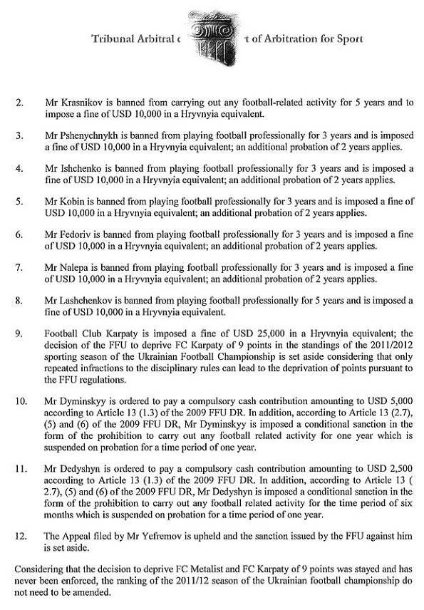 • на футболістів Пшеничних, Іщенка, Кобіна, Федоріва, Налєпу накладено заборону професійно займатися футболом протягом 3 років з додатковим випробувальним періодом на 2 роки, а також штрафні санкції у розмірі по 10 000 доларів США; на футболіста Сергія Лащенкова накладено заборону професійно займатися футболом протягом 5 років та штрафні санкції у розмірі 10 000 доларів США;