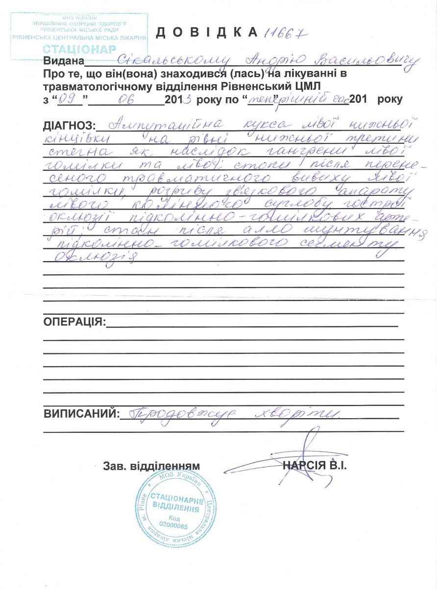 Допомогти здійснити таку на перший погляд звичайну, але таку заповітну мрію хлопця можна, переказавши кошти на рахунок його дружини у Приватбанку: 5167 9872 0834 3398 (Сікальська Марина Борисівна, тел. (050) 375 38 90).