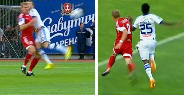 Оценка эпизода от Sport.ua: события происходят сразу после стартового свистка и задают тон разворачивающейся интенсивной борьбе. Сахневич не безупречно отбирает мяч у Ярмоленко, а затем на завершении начатой таким образом атаки падает в борьбе с Аруной. Видно, что и Аруна играет не совсем чисто – он отталкивает Сахневича руками, причем мячом в этот момент владеет Сахневич. Арбитр в обоих случаях промолчал и, на наш взгляд, имел на это право. Столкновение с Ярмоленко имело игровой характер, а движение руки Аруны – слишком неявным, для того чтобы прервать игру, а тем более и назначить пенальти.