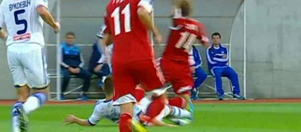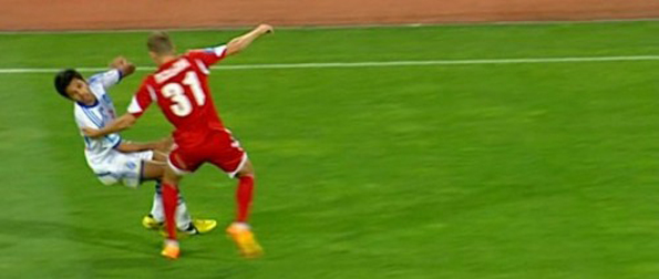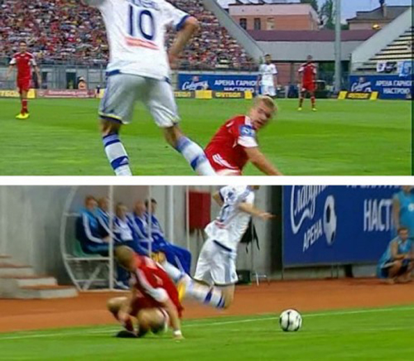 15 минута, №6 «Динамо» Драгович в подкате против № 14 «Металлурга» Шевчука.