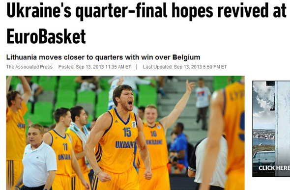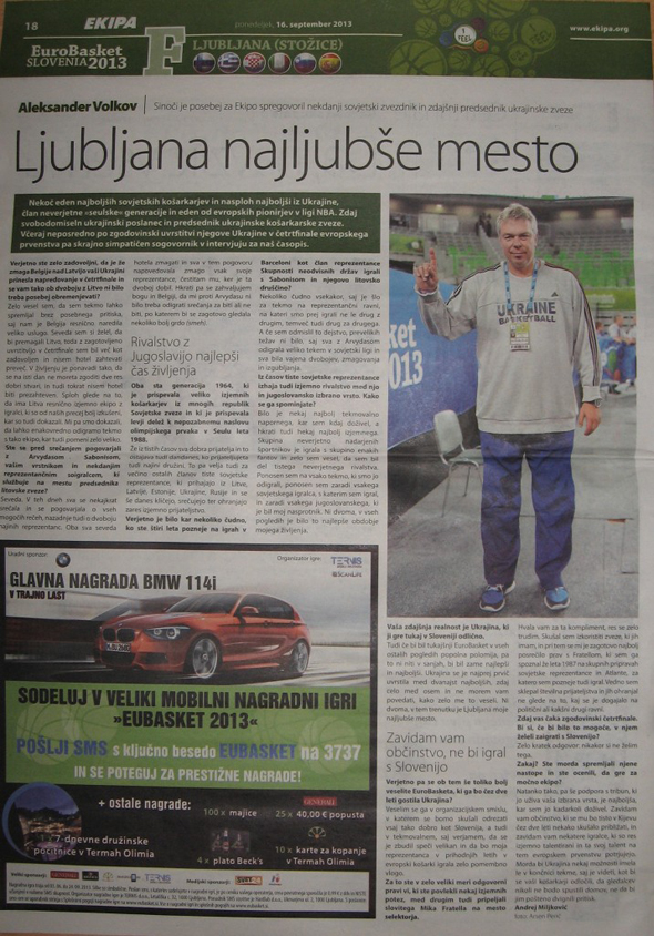 Національна збірна України поза сумнівом уже стала головною сенсацією ЄвроБаскету-2013. Сьогодні цілі шпальти місцевих газет присвячено нашій команді, чимало видань надрукували великі інтерв’ю Олександра Волкова. Нагадаємо, вчора українська збірна вперше в історії вийшла до чвертьфіналу чемпіонату Європи. Коли гравці й тренери, роздавши післяматчеві коментарі, поїхали до готелю. Черга журналістів з десятка різних країн вишикувалася до президента Федерації баскетболу України: за півтори години перерви між матчами не всі охочі встигли записати інтерв’ю з Олександром Анатолійовичем.