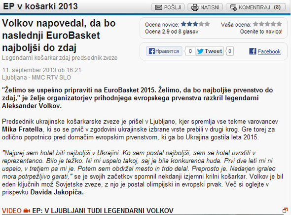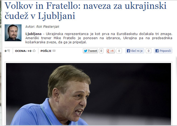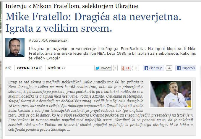 «Україна є найбільшим сюрпризом ЄвроБаскету-2013. На її лаві – жива легенда NBA Майк Фрателло. 1986-го його обуло обрано найкращим. Він привів «Атланту», «Клівленд» і «Мемфіс» протягом майже двох десятиліть до 667 перемог. Такого результату в NBA досягли лише 18 тренерів», – пише siol.net у врізі до інтерв’ю з Майком.