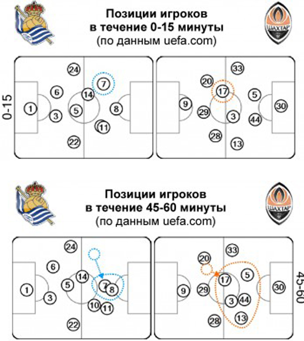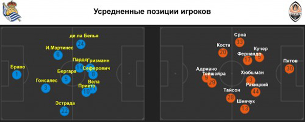 На диаграмме усредненных позиций игроков отчетливо видно скопление в центре поля и узость в действиях нападающих «Сосьедада». Их смещения на фланг носили лишь периодический, ситуационный характер. Нужно отметить, что такая тактическая манера целиком свойственна игре «Сосьедада» в Примере. Другое дело, что их часто поддерживали фланговые защитники. В данном матче сдержанная позиция Шевчука, сосредоточенного на обороне (аналогично недавнему матчу сборной), и наоборот – активность в движении вперед Срны, препятствовали широте в действиях крайних защитников хозяев.