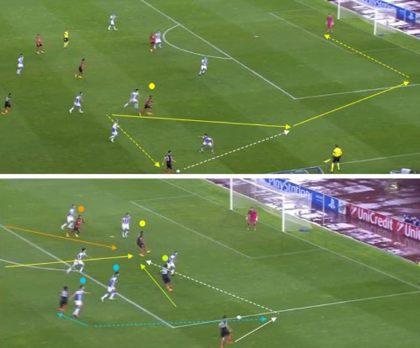 На верхнем кадре Фернандо (желтый) обыгрывается со Срной и после забегания выполняет поперечную передачу в штрафную. Во втором случае уже он является одним из адресатов характерной для «Шахтера» передачи на точку. Кроме него сюда же выдвигаются Тейшейра (зеленый) и Адриано (оранжевый).