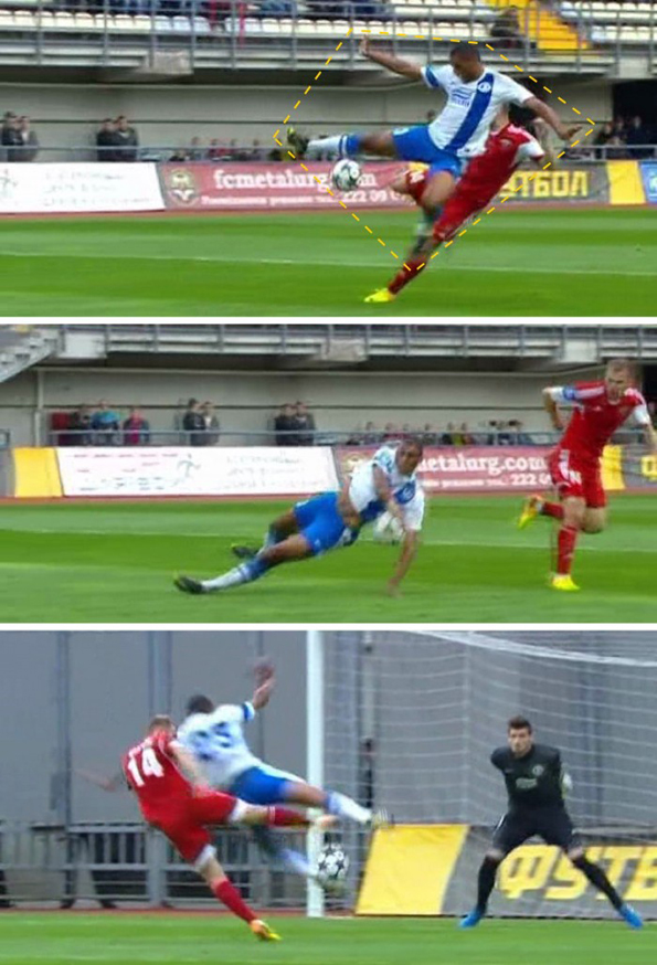 Однако, в данном случае игроку «Динамо» не хватило решительности или, можно сказать, опыта – активных действий с его стороны не последовало, либо арбитр их не усмотрел. Почувствовав руки защитника, Хачериди упал, чем поставил арбитра перед задачей оценки действий Пластуна уже не как последствий задержки, а другой стороны – как вызвавших или нет причину его падения.