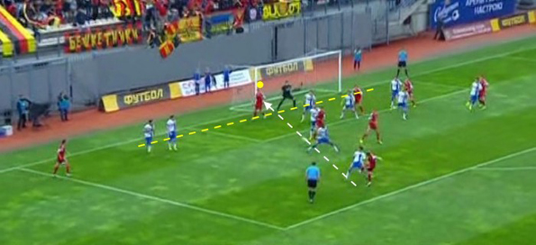 В данном случае, как сказано выше, в своих действиях Дуглас сознательно нарушает правила, перекрывая зону в направлении ворот, отмеченную пунктиром. Причем делает он это не одной, а двумя руками! Поэтому неважно когда – сразу или после касания мяча земли он попадает в руку Дугласу. Защитник «Днепра» сознательно идет на игру рукой. Именно поэтому, на наш взгляд, имеется нарушение правил и, как следствие, все основания для назначения одиннадцатиметрового. Дуглас играет рукой, причем сразу двумя руками.