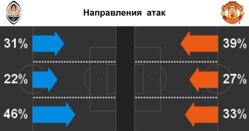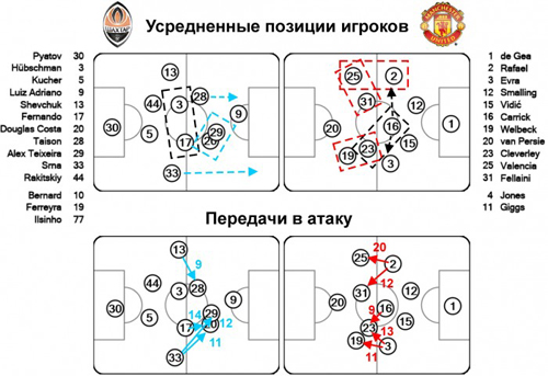 Как видно, в направлениях развития атак команды передачами также превалируют фланговые направления, причем исходят они в обоих случаях от защитников. Это очередная общая черта, объединяющая тактику команд, но уже в динамике паса. Как видно, наиболее производительным игроком в рядах МЮ оказался Рафаэль, отдавший в направлении Феллаини и Валенсии суммарно 32 передачи (всего 80). Со стороны «Шахтера» вновь безусловным лидером явился Дарио Срна, регулярно снабжавший пасом атакующий блок полузащиты. Всего по данным uefa.com он выполнил 131 передачу с точностью исполнения 75%.