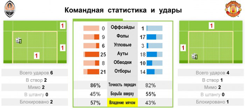Тем не менее, фактор «игры команды так, как ей это позволяет делать соперник» обязательно следует принимать во внимание. Судите сами: во-первых до перерыва соотношение числа нанесенных по воротам ударов составляло 3-3. После перерыва 4-1. Всего же предыдущем мате с «Байером» «Манчестер Юнайтед» ударил по воротам 16 раз против всего 7 с «Шахтером». Даже если вычесть 7 ударов отсутствовавшего теперь Руни, остается 9 ударов, в том числе 5 - в створ. Сейчас же «Манчестер» кроме гола нанес с игры всего 1 удар по воротам соперника за весь матч. Это лишь третий подобный случай с 2006 г, при том, что команда каждый год регулярно играет в Лиге чемпионов. Возвращаясь к «Байеру», также можно вспомнить, что в том матче «Манчестер Юнайтед» владел мячом 58% игрового времени против нынешних 43%. Слишком большая разница, даже учитывая то, что это другой матч и другой соперник.