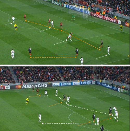Наконец, кроме направленности и темпа в развитии атакующих действий налицо бросались общие черты, которые были свойственны командам в глубине атаки, и, в свою очередь, обороны. Развитые в неспешном темпе, атаки обеих команд достигали охватывающей штрафную стадии, где игроки передних линий занимали встроенное положение в оборонных порядках соперника. На кадрах ниже видно, что так в обоих случаях поступает атакующая вправо команда. Вверху это «Манчестер Юнайтед» (белые) в первом тайме, внизу – «Шахтер» (оранжевые) во втором. Видно наличие общих черт, в том числе использования забеганий на фланге. Кстати именно в таких атаках, а не действиях через центр, где «горняки» тоже давили соперника, были забиты оба мяча. В этом матче соперники отличались количеством и (иногда) направленностью, но не характером и долями таких позиционных атак в структуре игры.
