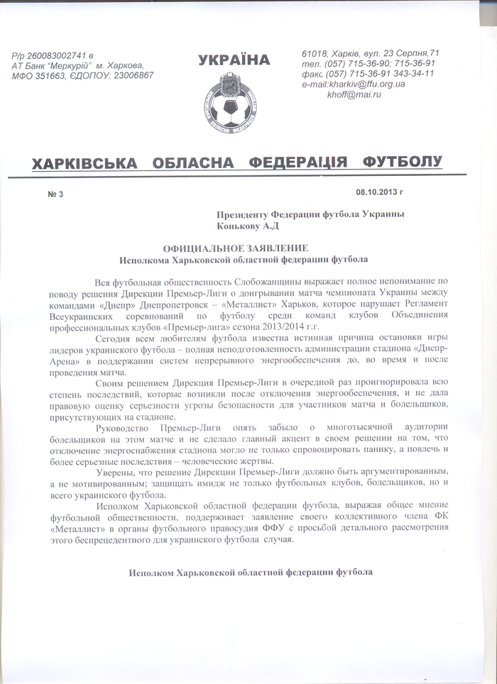 Областная Федерация футбола Харькова обратилась к президенту ФФУ Анатолию Конькову касательно решения Премьер-лиги о доигровке матча «Днепр» - «Металлист». Исполком ХОФУ написал письмо Конькову с просьбой вмешаться в сложившуюся ситуацию и пересмотреть решение по беспрецедентному случаю.