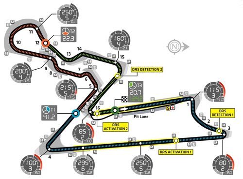 Головний біль усіх стратегів – Pirelli – на найближчий уїк-енд привезла добре знайому всім комбінацію гуми Medium і Soft, що в свою чергу означатиме тактику двох піт-стопів за нормального ходу подій на трасі. Значно цікавіше буде подивитися хто й у якому порядку буде використовувати комплекти – консервативно Soft-Medium-Medium, чи більш агресивний варіант з двома відрізками на м’яких шинах або інший порядок старту та зміни шин на дистанції.
