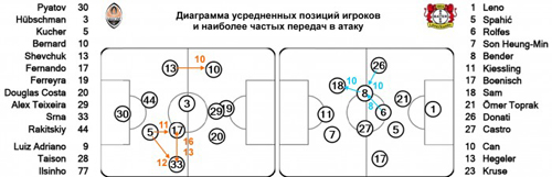 О превосходстве в атакующих действиях игроков центра «Байера» говорят не только их позиции на схеме, но и итоговые цифры. Общее число передач полузащитников центра поля как правило всегда велико. Это объективно, так как в центре поля происходят большинство событий практически любого матча и находящиеся здесь игроки как правило участвуют в розыгрыше. Поэтому более показательным будет участие этих игроков на завершающих стадиях атак. И тут мы видим, что Фернандо и Хюбшман на двоих выполнили одну ключевую передачу при двух на счету Бендера и Кастро. Но главное – оба этих игрока нанесли 5 ударов по воротам при лишь одном ударе Хюбшмана. Стало быть превосходство в агрессивности игроков центра поля принадлежит стороне «Байера». В противном случае Луческу следует признать, что хорошо обороняться достаточно, для того, чтобы «быть лучше».