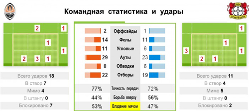 Да, «Шахтер» нанес гораздо больше ударов по воротам. Однако в створ из них попало 7 и 4 соответственно. Не слишком впечатляющее преимущество. Особенно, с учетом того, что «лучше» это еще и «эффективнее». А вполне возможно и вовсе поставить между этими понятиями знак равенства. Легко подсчитать, что точность ударов «Шахтера» составила 39%, «Байера» - 36%. А по версии uefa.com (в том числе в таблице ниже), которая несколько по-иному учитывает удары, в частности заблокированные, это соотношение и вовсе составляет 55% к 73%.
