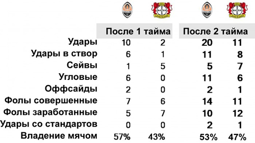 Наконец любопытной представляется оценка изменения итоговых показателей матча по ходу игры. Табличные данные uefa.com показывают, что соотношения числа ударов, ударов в створ и угловых по итогам первого и второго таймов сильно разнятся. То же самое можно сказать о преимуществе «Шахтера» в контроле мяча, которое упало с 57% до едва заметных 53%.