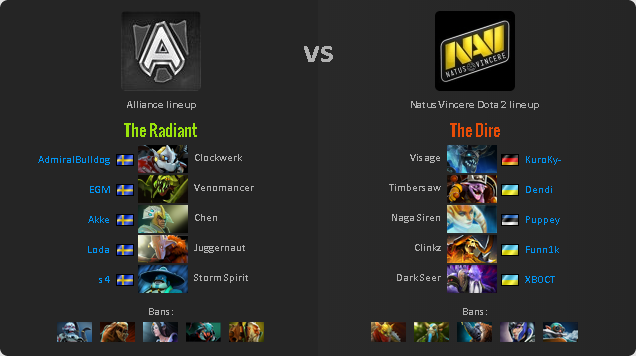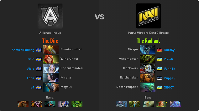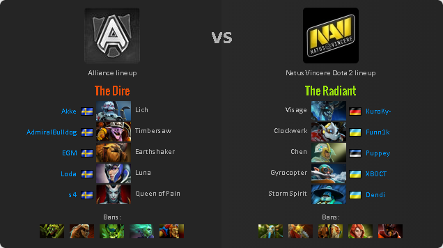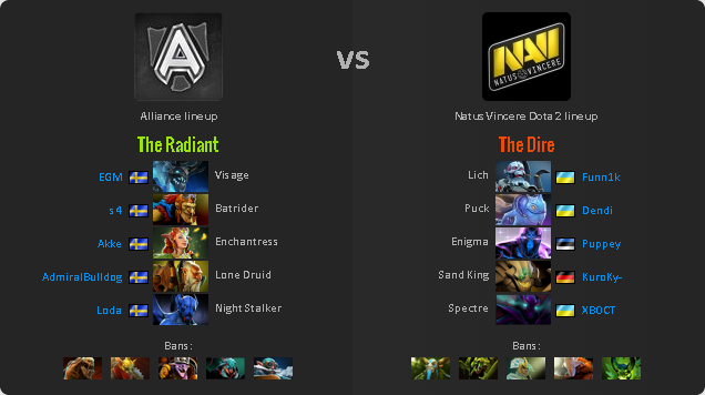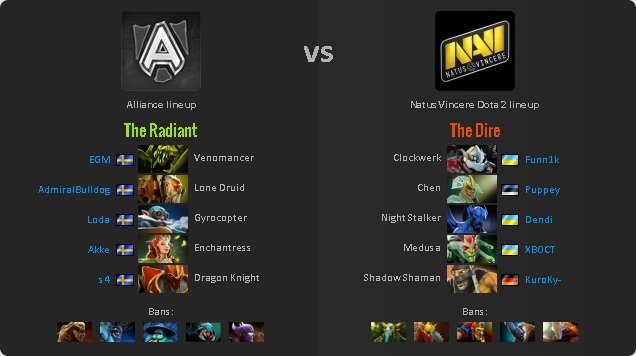 В ранней игре Natus Vincere выглядели гораздо лучше своих оппонентов. Alliance старались сгруппироваться и пушить линни вместе с Lone Druid, однако это не позволяло им защищать свои линии от Chen'а и Shadow Shaman'а. Кроме того, шведы не могли контролировать темп игры, который был задан Night Stalker'ом и Clockwerk'ом. Тем временем XBOST на Medusa стал настолько "толстым", что с правиться с ним в драке стало невозможно. Alliance просто ничего не смогли поделать с пиком Na`Vi.